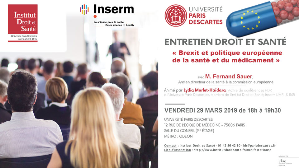 L’Institut Droit et Santé (IDS) a le plaisir de vous inviter à débattre dans le cadre des Entretiens Droit et Santé avec M. Fernand Sauer, Ancien directeur de la santé à la commission européenne, sur le thème « Brexit et politique européenne de la santé et du médicament ».