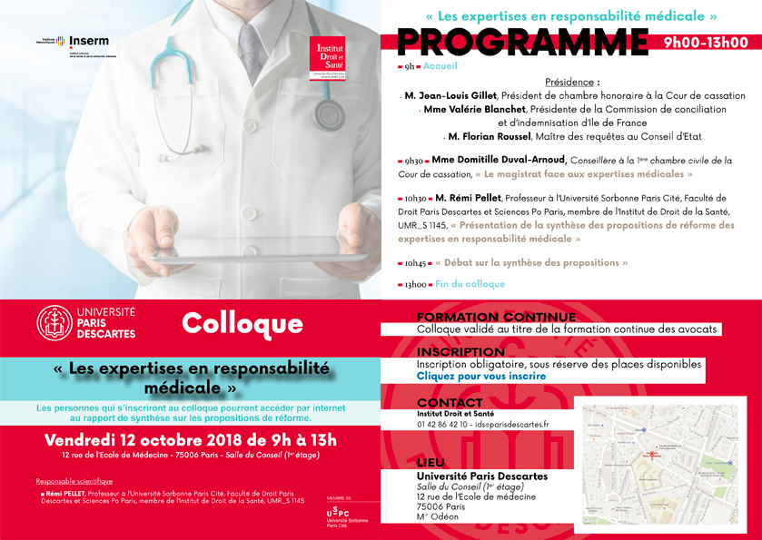 Monsieur Rémi PELLET, Professeur à l’Université Sorbonne Paris Cité, Faculté de Droit Paris Descartes, membre de l’Institut de Droit de la Santé, UMR_S 1145, organise un colloque sur le thème des "expertises en responsabilité médicale".