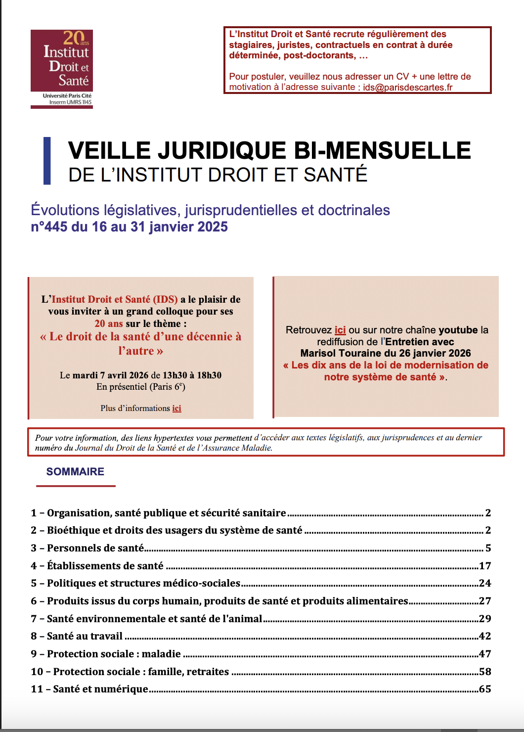 20 ans de l’IDS « le droit de la santé d’une décennie à l’autre » 07/04/26 à 13:30