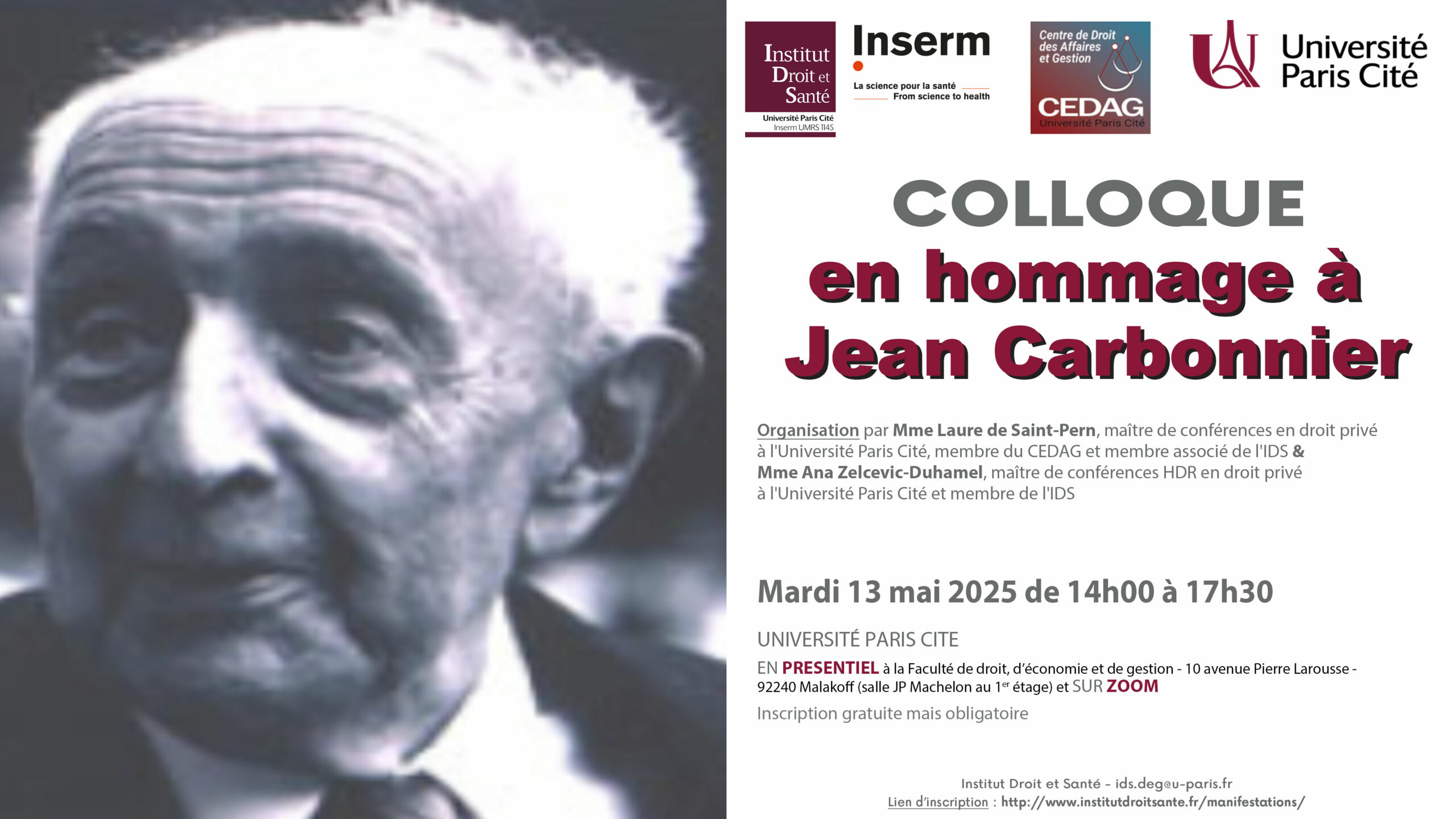 L’Institut Droit et Santé (IDS) et le Centre de droit des Affaires et de Gestion (CEDAG) vous invitent à un colloque en hommage à Jean Carbonnier le mardi 13 mai 2025 de 14h00 à 17h30 sur le thème « Moderne ou conservateur ? Humaniste et universaliste ».