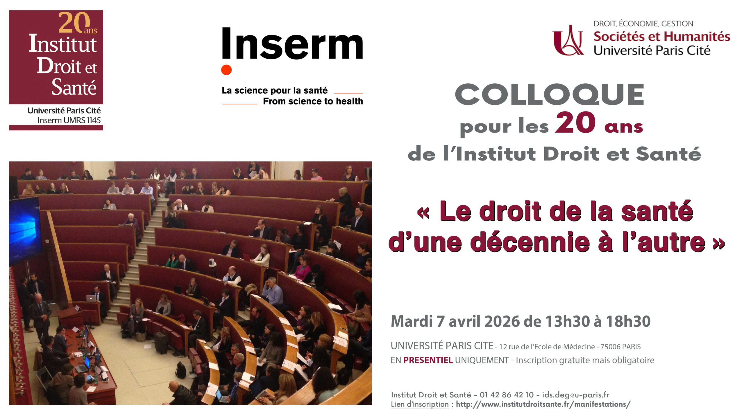 Le mardi 7 avril 2026 de 13h30 à 18h30, l’Institut Droit et Santé (IDS) a le plaisir de vous inviter à un grand colloque en l’honneur de ses 20 ans sur le thème suivant : « Le droit de la santé d’une décennie à l’autre », dans le grand amphithéâtre de l’Université Paris Descartes, au 12, rue […]