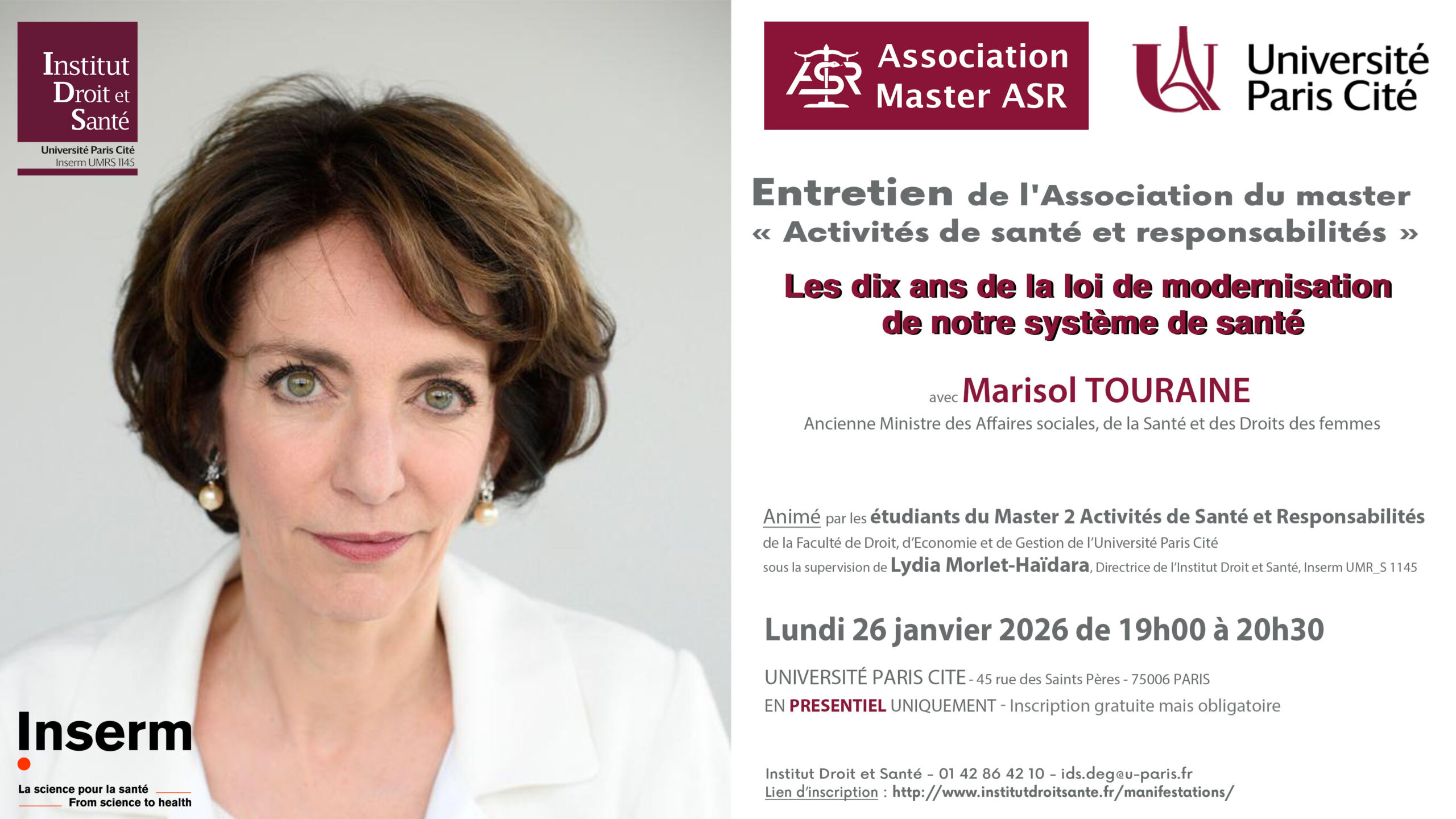 Les étudiants du Master 2 Activités de Santé et Responsabilités (ASR) de la Faculté de Droit, Economie et Gestion, en partenariat avec l’Institut Droit et Santé (IDS) ont le plaisir de vous inviter à débattre en présentiel uniquement le lundi 26 janvier 2026 de 19h à 20h30 dans le cadre d’un Entretien avec Marisol Touraine, ancienne […]