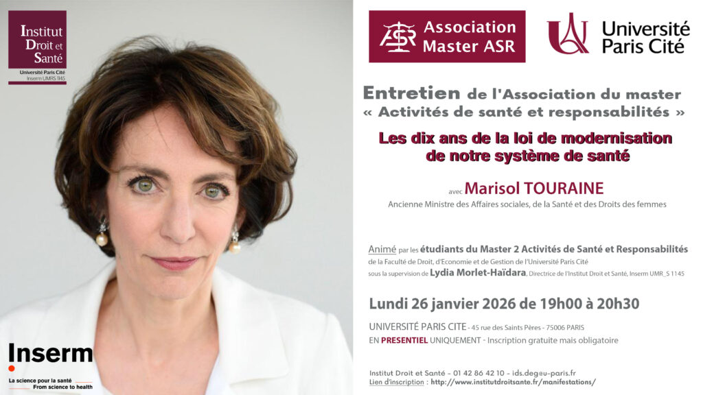 Les étudiants du Master 2 Activités de Santé et Responsabilités (ASR) de la Faculté de Droit, Economie et Gestion, en partenariat avec l’Institut Droit et Santé (IDS) ont le plaisir de vous inviter à débattre en présentiel uniquement le lundi 26 janvier 2026 de 19h à 20h30 dans le cadre d’un Entretien avec Marisol Touraine, ancienne Ministre des Affaires sociales, de la Santé et des Droits des femmes, sur le thème « Les dix ans de la loi de modernisation de notre système de santé ».