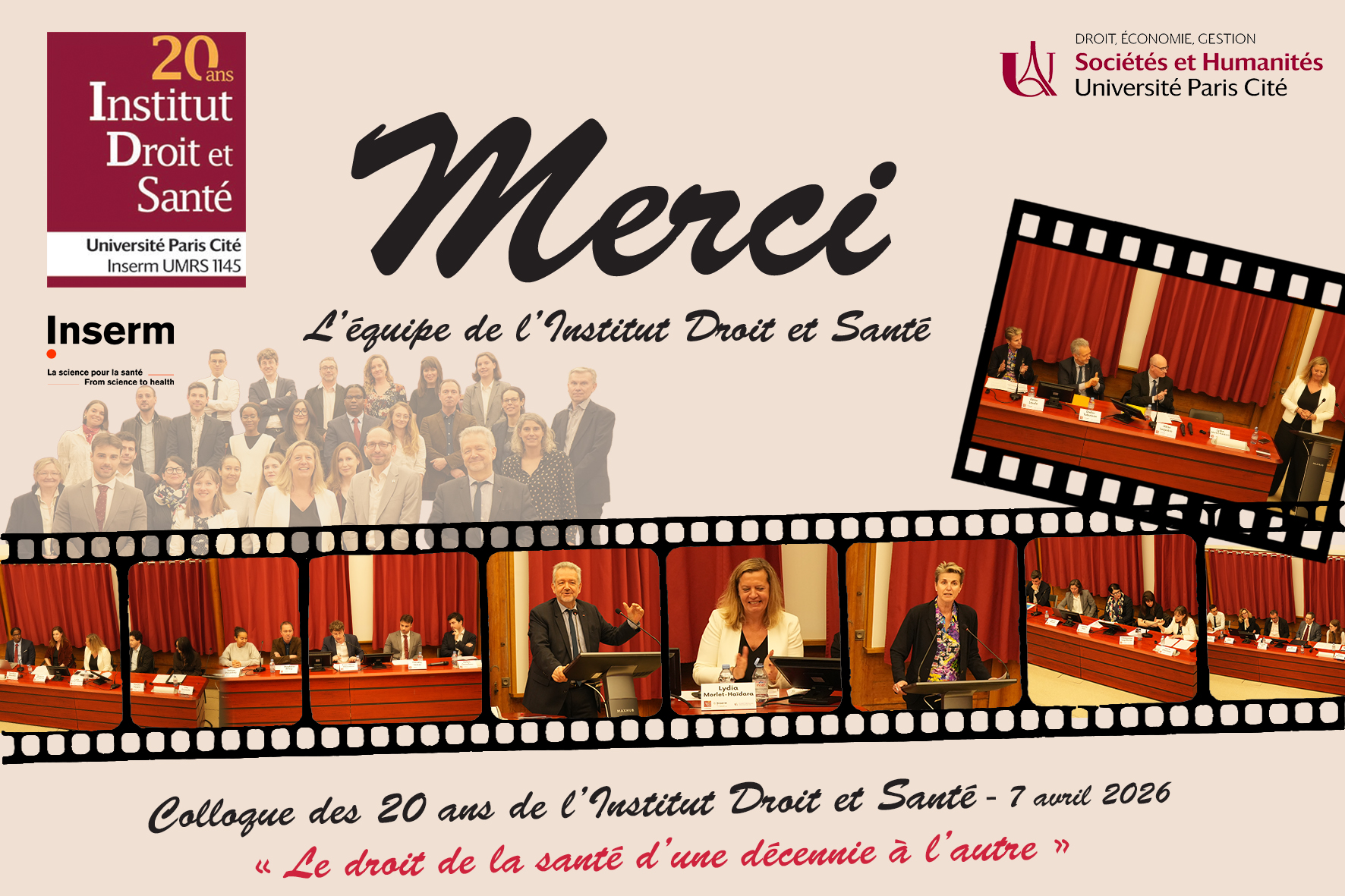 Le mardi 7 avril 2026 après-midi, l’Institut Droit et Santé (IDS) a eu le plaisir de vous convier à un grand colloque en l’honneur de ses 20 ans sur le thème suivant : « Le droit de la santé d’une décennie à l’autre ».