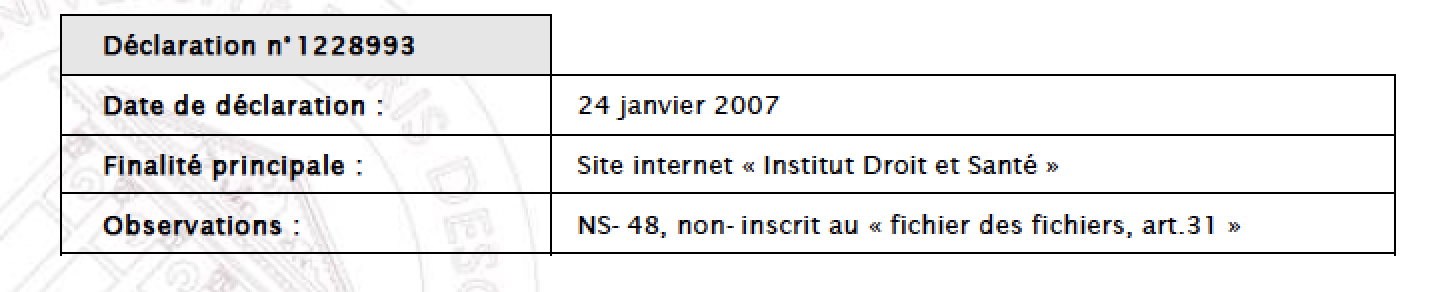 Le site internet de l’Institut Droit et Santé relève de la dispense de déclaration n°7 de la Commission nationale de l’informatique et des libertés (CNIL). Vous disposez d’un droit d’accès, de rectification et de suppression aux données vous concernant.