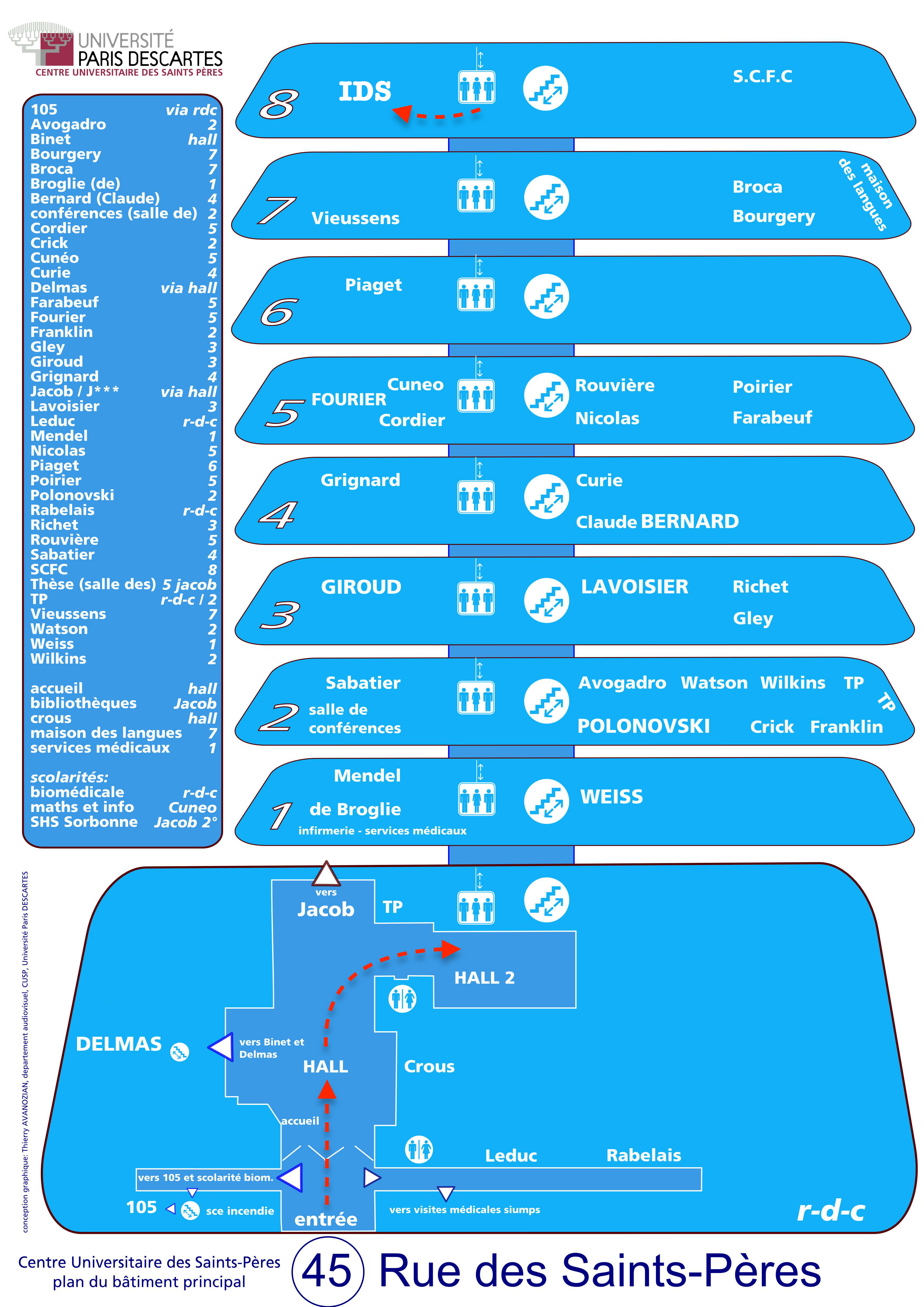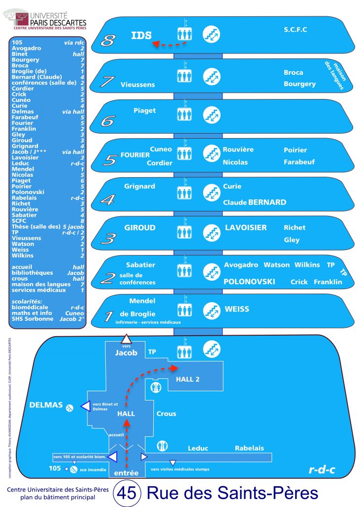 En entrant dans l’immeuble par l’entrée principale située au 45, rue des Saints Pères, entrez dans le grand hall et après la cafétéria, tournez à droite.