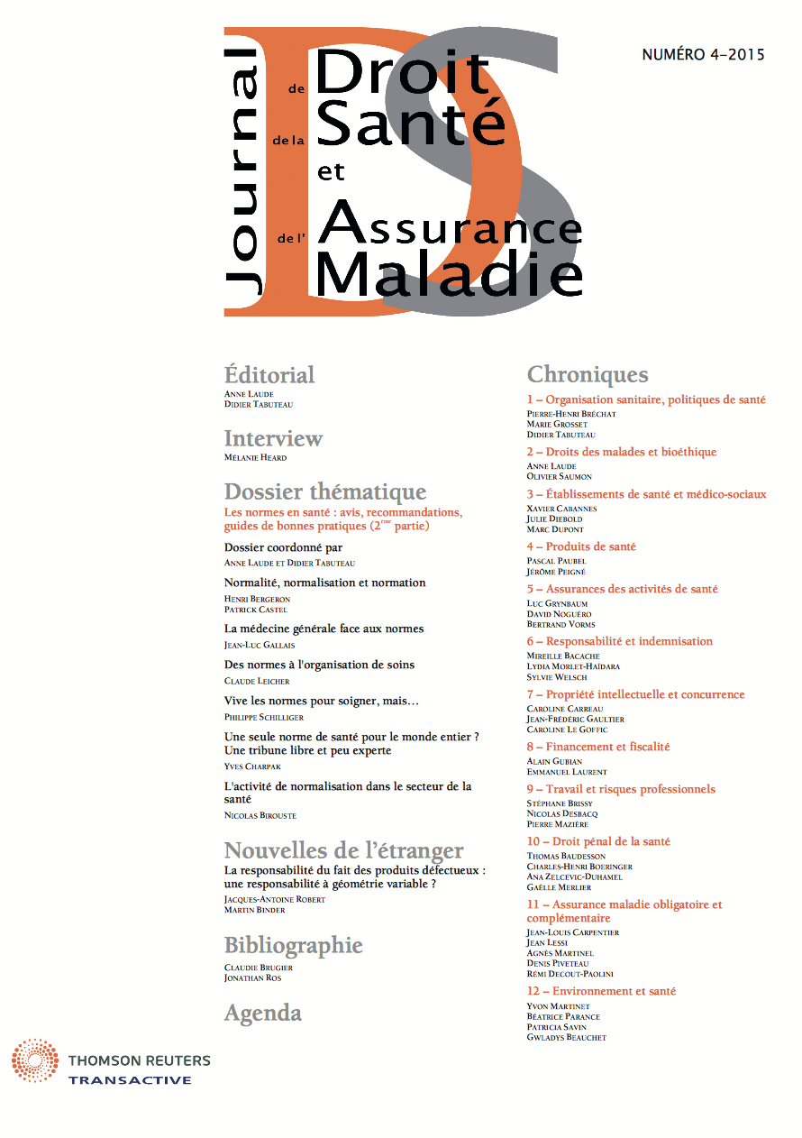 Dans le prolongement du précédent dossier du JDSAM présentant la première partie des actes du colloque sur les normes en santé que l’Institut Droit et Santé a organisé, soulignant la diversité des normes en particulier médicales, sociales, ou juridiques, les lecteurs découvriront dans ce nu- méro non seulement les aspects internationaux de ce processus d'expansion et de diversification des normes, mais aussi une analyse des conséquences de ces mécanismes. Si les nouvelles normes en santé prennent souvent la forme de recommandations ou de référentiels, elles visent néanmoins à avoir, comme le souligne l’article de Messieurs Bergeron et Castel, un impact sur l’autonomie des médecins, présentée comme une propriété quasi-inaliénable, pour les rendre hétéronomes, c'est-à- dire moins autonomes, dans leur jugement et activité thérapeutique. Mais à l’instar de ce que mon- trent les résultats des campagnes de prévention et d’éducation à la santé, les médecins résistent, comme les citoyens, à ces velléités de normalisation.