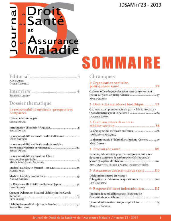 Nul doute que la comparaison de ces pays de cultures juridiques très variées peut être une source d’inspiration pour les juristes et les réformateurs du droit de la responsabilité médicale en France. Le JDSAM remercie tout particulièrement les auteurs et le coordinateur du dossier pour la richesse du panorama ainsi offert à ses lecteurs.